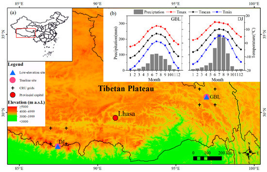 The study was conducted in two elevational transects, i.e., the Gubailin transect (GBL, 4450–4530 m) and the Dingjie transect (DJ, 3380–3920 m), situated in the Changdu and Dingjie County, respectively, of the Tibetan Plateau (Figure 1), where the climate is mainly influenced by the Indian Summer Monsoon and Westerlies [38]. Monthly mean temperature ranges from −6 to 10 °C and from −10 to 6 °C, and the total annual precipitation is around 450 mm and 845 mm, with most of it falling in the summer, for the two transects, DJ and GBL, respectively. The climate data are from the CRU TS 4.04 data set (https://catalogue.ceda.ac.uk/uuid/89e1e34ec3554dc98594a5732622bce9, accessed on 10th June 2020).