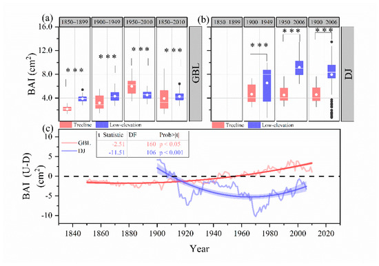 Comparisons of the mean values of tree-ring BAI between the treeline (U) and low-elevation (D) plots for the two elevational transects GBL and DJ over different time periods (a,b), and (c) the difference (U-D) in BAI between treeline and low elevation. The black dots represent outliers as judged by more than 3 standard deviations departed from the mean values. *** denotes significant difference of means between the compared groups at p < 0.001 level. The bold lines in (c) are regression lines and the shaded area denotes the 95% confidence intervals of the regressions.