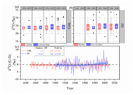 In this study, the δ13C series was not detrended because we intended to compare the absolute values among different elevations, rather than infer any trends or correlate with other time series, such as climate variables. However, the significant increase in the atmospheric CO2 concentrations may affect the comparison of δ13C and iWUE [33,46]. Therefore, we divided the research period into many slices, with a window-length of approximately 50 years, and then made comparisons over different periods. By doing so, we aimed to see if increased atmospheric CO2 concentrations have led to different elevational patterns for the compared data. Tree-ring isotopes were measured over the period from 1850 to 2010 for the GBL transect, and from 1900 to 2006 for the DJ transect.