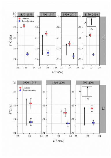 Relationships between δ13C and δ18O in treelines vs. low elevations in two species at GBL (a) and DJ (b) transect. Mean values (symbols) ± 1 SE are shown. Shifts in the isotopic space are represented by arrows. The insets display the relative changes in the corresponding photosynthetic assimilation rate (A) vs. stomatal conductance (gs) responses, according to the dual-isotope conceptual model. Note that the upward vertical arrows show the increase in the δ13C from low elevation to treeline over equal or similar δ18O values, which is a typical scenario of constant stomatal conductance and increasing photosynthesis in the carbon and oxygen double-isotope model [37].