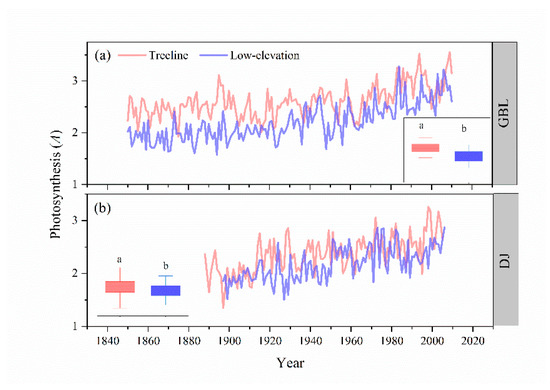 The temporal changes in photosynthesis (A) for each forest stand of the two elevational transects GBL (a) and DJ (b). The photosynthesis rates are derived from a transformation of Equation (4): A = iWUE·gs = iWUE·δ18O. Different letters demonstrate significant differences (p < 0.05) between treelines and low-elevation forests based on two-tailed two-sample t-tests, assuming equal variance.