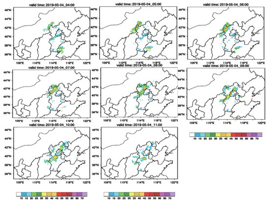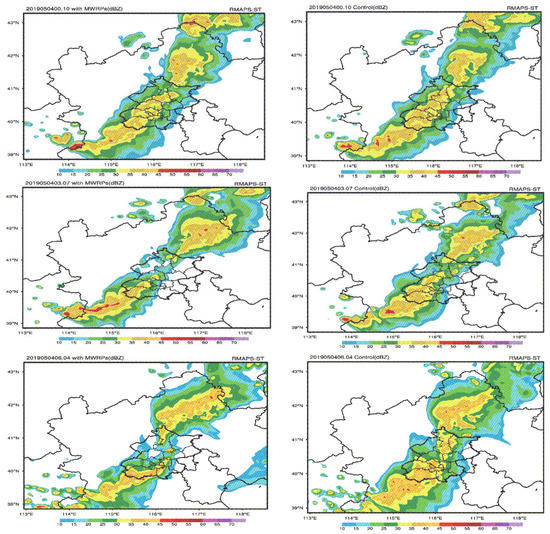 Based on the analysis field formed by assimilation in the two experiments in Section 3.1, we compare the prediction results after assimilation. For the phenomenon of the belt-shaped echo splitting in Beijing on 4 May 2019, the radar reflectivity simulations at 1000UTC of the two groups of experiments are compared. Figure 6 shows the simulated radar reflectivity in the MWRPS and Control experiments, the left side shows the simulation results obtained from the MWRPS case, initialized at 0000 UTC, 0300 UTC, and 0600 UTC, respectively, whereas the right side shows the simulation results obtained from the Control case. Generally, the radar echo zone corresponds to the location of a convection cell and the radar reflectivity intensity corresponds to the convection intensity in the convection cell.