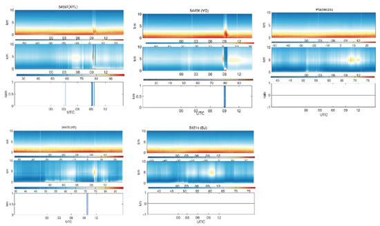 Time-height profile of temperature and humidity profile of five ground-based microwave radiometers in Beijing on 4 May 2019 and the judgment of precipitation at corresponding time from the MWRPS located in Xiayunling; Yanqing, Pinggu, Huairou, and Southern suburb of Beijing. Note: the blue bar indicates the period of rain in the ground-based microwave radiometer observations.