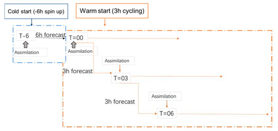 Each group of experiments performs a cold start from 1800 UTC on 3 May 2019, and predicted for six hours to obtain the forecast field at 0000 UTC on 4 May 2019, which is used as the background field to assimilate the observed data. Then, 0300 UTC is driven by the 3-h forecast field of 0000 UTC, and the 0600 UTC experiment is driven by the 3-h forecast field of 0300 UTC (see Figure 4 for the test flow). The two-step assimilation method of RMAPS-ST is carried forward. In the first step, conventional data and ground-based microwave radiometer data are assimilated; in the second step, radar observations are assimilated.