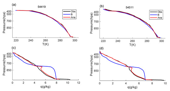 (a,b) Vertical profiles of the temperature profiles (K) from observation (black lines), background (blue lines) and analysis (red lines) at verification station (54419, 54511); and (c,d) the specific humidity profiles (g kg−1) at analysis time (0600 UTC, 4 May 2019).