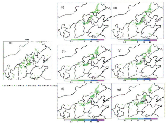 Distribution of forecasts of 1-h accumulated precipitation between 1000 UTC and 1100 UTC on 4 May 2019 estimated by observation based on ground stations (a); forecasted by MWRPS simulations initialized at 0000 UTC (b), 0300 UTC (d), 0600 UTC (f) on 4 May 2019; forecasted by Control simulations initialized at 0000 UTC (c), 0300 UTC (e), 0600 UTC (g) on 4 May 2019.