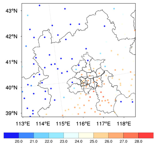 Figure 8 shows the spatial distribution of 2m air temperature observed at 09: 00 UTC before the echo moved to the urban area in Beijing. Referring to Zhang et al. (2017), we select black rectangular boxes to identify the heat island intensity and make statistical analysis. At 0900 UTC, this region, including urban and suburban areas in Beijing, report no precipitation. It can be seen that before the belt-shaped echo moves to the urban area of Beijing, there is no obvious difference between the urban temperature in the Fifth Ring Road and that in its surrounding area. The heat island intensity in Beijing is weak [43].