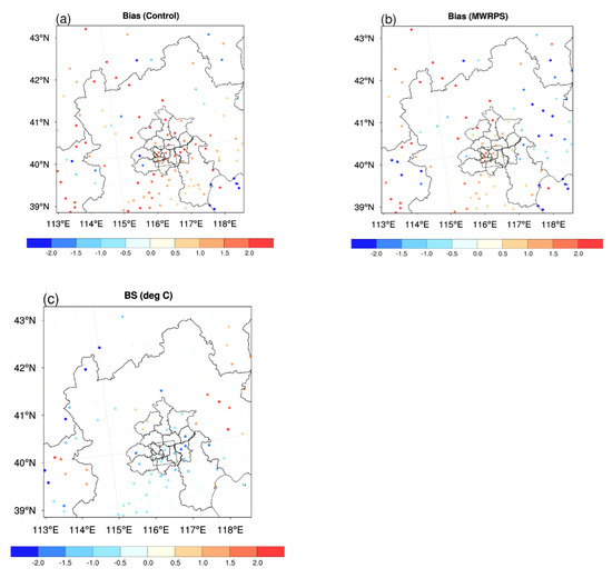 As indicated by the spatial distribution of 2m temperature bias at 0900 UTC predicted by the two groups of experiments (Figure 9a,b), the temperature deviation predicted by the Control test in and around Beijing’s Fifth Ring Road (black rectangular frame) is larger than that by the MWRPS test. Especially, the Control test overestimates the observed heat island intensity in the urban area within the Fifth Ring Road. The assimilated data of the ground-based microwave radiometers corrected the warm bias in this area, and the modified indexes of 2 m air temperature are all negative, which is closer to the observation (Figure 9c).