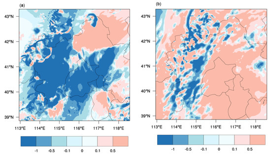 (a) Temperature field difference between MWRPS test and Control analysis (MWRPS minus Control, model level = 1) valid from 0600 UTC on 4 May 2019 (Beijing–Tianjin–Hebei region); (b) the same to (a), but for Level 27 of the model.
