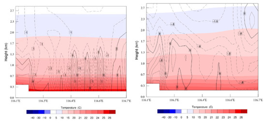 Furthermore, we compare the temperature difference in both the bottom layer and the high layer from analysis fields of the two experiments initialized at 0600 UTC 4 May 2019. We find that negative difference in the bottom layer and positive difference in the high layer in Beijing where the data of ground-based microwave radiometers are assimilated. Compared with the Control test, the MWRPS test has thermal changes in low-level cooling and high-level heating (Figure 10) in its analysis field. The data assimilation of the ground-based microwave radiometers makes the atmospheric stratification of the initial field in this area more stable, and the analysis field lacks the environment support to the emergence and development of convection, which is not conducive to the emergence of precipitation. The ground-based microwave radiometer leads to the cooling of the bottom layer in Beijing in the analysis field of the MWRPS test (Figure 10). The system modifies the initial field in time, thus affecting the prediction of air temperature.
