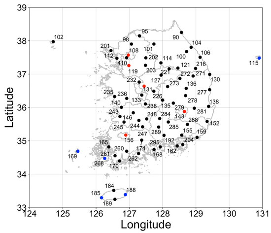 Location of the ASOS observation site in South Korea. Red and blue points indicate the representative sites in urban and island regions.