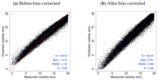 Figure 4 shows the RF results using training data (2017–2018). The RF model predicts variables in the direction of lowering the variance but shows a positive bias for low predicted values and a negative bias for relatively high values [66,67]. Therefore, bias correction was performed using the equation Y = 1.18 × −2.49, which increased the predictive performance of the model relative to the VISASOS data, with an RMSE of 1.04 km (without bias correction) and 0.88 km (with bias correction).