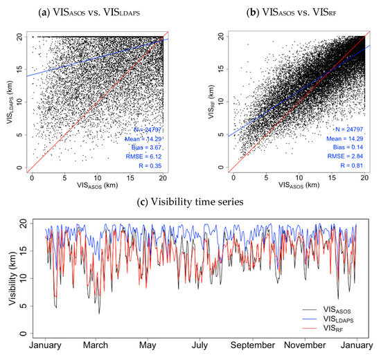 To evaluate the accuracy of the visibility predictions, variability data from the ASOS and the UM Local Data Assimilation and Prediction System (LDAPS) [57] were used. As shown in Figure 1, the ASOS visibility data were acquired using the Biral VPF730 (24 sites) and Vaisala PWD22 (48 sites) models based on 72 observation sites distributed across South Korea (Table 1). These sensors measure visibility in the range 0.01–20 km with uncertainty of ±10–15% within the measurement range [58,59]. The red and blue points in Figure 1 indicate the representative sites in urban and island regions analyzed in the results (Section 3). Visibility data from the UM LDAPS are local predictions provided by the Korea Meteorological Administration (KMA) with a spatiotemporal resolution of 1.5 × 1.5 km2 at 3-h intervals eight times a day (+0–36-h predictions at 3-h intervals at 0000, 0600, 1200, and 1800 UTC and +0-h and 3-h predictions at 0300, 0900, 1500, and 2100 UTC), derived using a 3-dimensional variational data assimilation (3DVAR) method [60,61]. We used the analysis fields data (+0-h), which predicts at 3-h intervals eight times a day. As the UM LDAPS predicts visibility in the range 0.01–100 km, data for ranges > 20 km were limited to 20 km (maximum), according to the measurement range of visibility sensors, and analyzed. The same conditions were applied to results predicted by using the RF model. For comparison, bias, root mean square error (RMSE), and correlation coefficients (R) were calculated for the visibility data predicted by the RF (VISRF) and LDAPS (VISLDAPS) models, and the visibility measurements from the ASOS (VISASOS), using Equations (2–4):