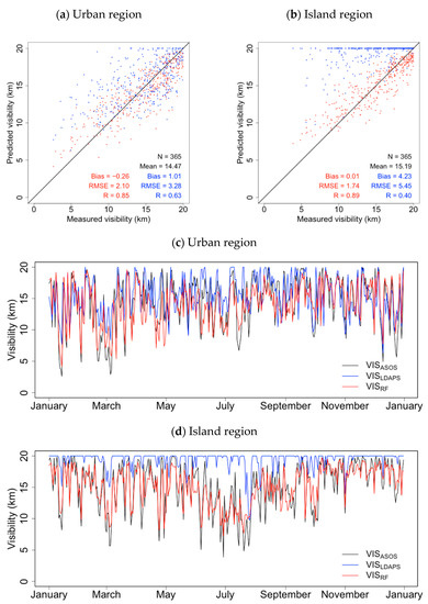 The RF model showed the best predictive performance during the dry season (bias = 0.63 km, RMSE = 2.56 km, and R = 0.87) when the RH and precipitation are low and the mass concentrations of air pollutants are high. Furthermore, in urban region with high mass concentrations of air pollutants, the correlation (R) between the VISRF predictions and pollutants ranged from −0.52 (SO2) to −0.72 (SU); in island region, with warmer and wetter conditions, correlations (R) between the VISRF predictions and RH and precipitation were −0.72 and −0.41, respectively. These results demonstrate that the predictions of the RF model reflected the meteorological conditions most strongly affecting visibility in both urban (bias = −0.26 km, RMSE = 2.10 km, and R = 0.85) and island (bias = 0.01 km, RMSE = 1.74 km, and R = 0.89) regions. In contrast, the VISLDAPS predictions for urban and island regions showed a bias, RMSE, and R of 1.01 km, 3.28 km, and 0.63, and 4.23 km, 5.45 km, and 0.40, respectively, indicating generally poor predictive performance.
