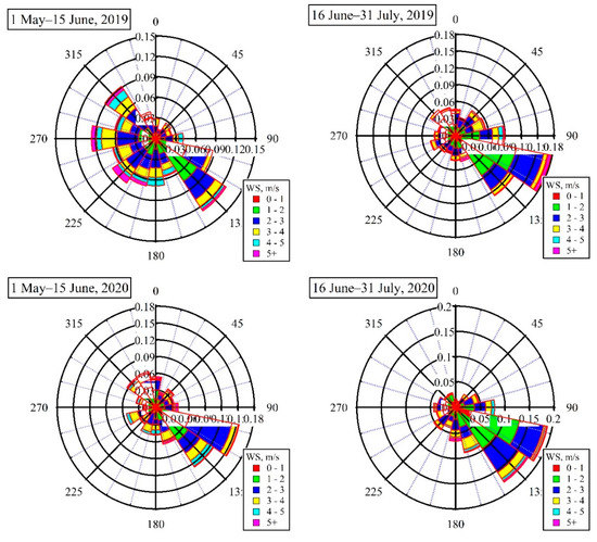 Comparison of wind rose plots during 1 May–15 June and 16 June–31 July of 2019 and 2020.