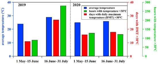 Comparisons of average temperature, hours with temperatures greater than 30 °C, and days with daily maximum temperature (DMT) greater than 30 °C among four periods (i.e., 1 May–15 June and 16 June–31 July 2019 and 2020) excluding those days with precipitation and wind speed larger than 3.4 m/s.