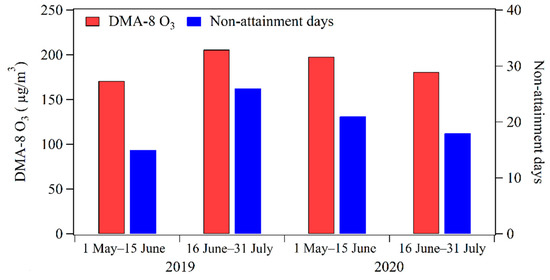 Comparison of DMA-8 h O3 concentrations and O3 non-attainment days during 1 May–15 June and 16 June–31 July in 2019 and 2020.