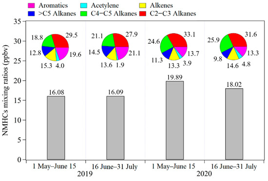 Average NMHCs mixing ratios at the Ji’nan site during 1 May–15 June and 16 June–31 July in 2019 and 2020 were compared in Figure 5. In general, the average mixing ratio of NMHCs during May–July 2020 was 18.95 ppbv, which was 17.8% higher than the result (16.09 ppbv) for 2019. For the two periods in 2020, the average NMHCs mixing ratio during 16 June–31 July was 18.02 ppbv, which was slightly lower than the result (19.89 ppbv) during 1 May–15 June.