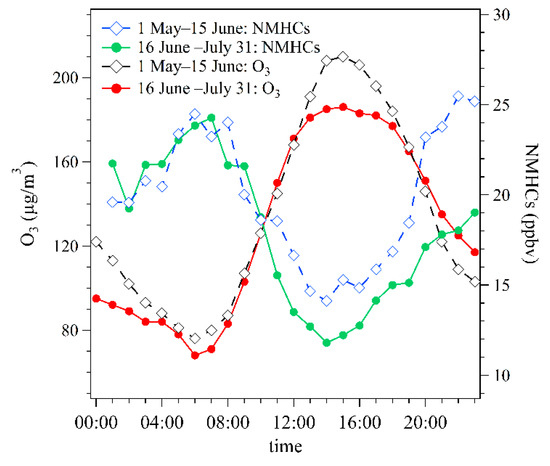 Average diurnal variation patterns of hourly average O3 concentrations and NMHCs mixing ratios during 1 May–15 June and 16 June–31 July of 2020.