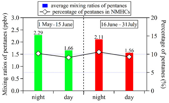 Average mixing ratios and percentages of pentanes during daytime (06:00–20:00) and nighttime (20:00–06:00) during 1 May–15 June and 16 June–31 July of 2020.