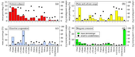 Chemical profiles of 4 factors resolved by the positive matrix factorization (PMF) model. (a) vehicle exhaust (red), (b) paint and solvent usage (yellow), (c) gasoline evaporation (blue), and (d) biogenic emission (green). The bars mean percentages of individual species in the summed mass concentrations of 19 NMHCs for each factor. The filled diamonds represent the relative contributions of each factor to the total measured mass concentrations for individual NMHC species.