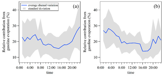 Average diurnal variation patterns of relative contributions from gasoline evaporation to NMHCs mass concentrations during (a) 1 May–15 June and (b) 16 June–31 July of 2020.