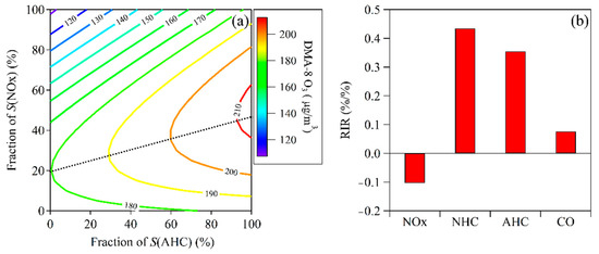(a) Relationship of DMA-8h O3 concentrations with relative change of S(AHC) and S(NOx) and (b) average relative incremental reactivity (RIR) values for NOx, NHC (i.e., isoprene), anthropogenic NMHCs (AHC), and CO during May–July of 2020.