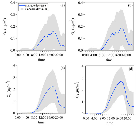 Average diurnal variation patterns of decreases for O3 concentrations simulated by the observation-based model (OBM) for all days and non-attainment days in 1 May–15 June 2020. (a) the scenario 1 versus baseline scenario for all days, (b) the scenario 1 versus baseline scenario for non-attainment days, (c) the scenario 2 versus baseline scenario for all days, (d) the scenario 2 versus baseline scenario for non-attainment days.