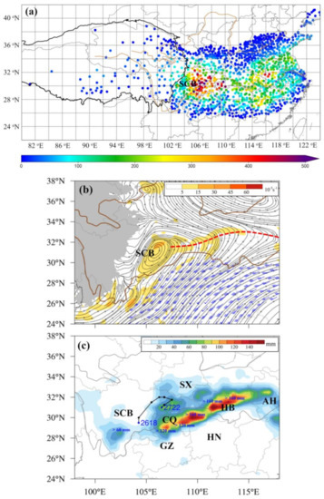 Every year, floods cause serious economic losses and heavy casualties in different regions, which make them one of the most serious natural disasters worldwide [1]. For China, on average, the direct economic loss due to floods is around 250 billion RMB each year [2]. According to statistics, the most severe floods of China mainly appeared in the Yangtze River Valley (YRV), due to the heavy precipitation during the Meiyu season [3], such as the famous 1931, 1954, and 1998 floods [4,5]. In summer 2020, the YRV experienced another abnormal Meiyu season [5,6], with its accumulated precipitation breaking the historical record of events since 1961. The 2020 flood caused more than 140 dead/missing and about $12 billion of economic losses [6], which made it the worst flood in recent decades. The Sichuan Basin (SCB) and its surroundings were one of the most severely affected areas during the 2020 Meiyu season, with some sections of the basin experiencing a once-in-a-hundred-year flood [5,6].