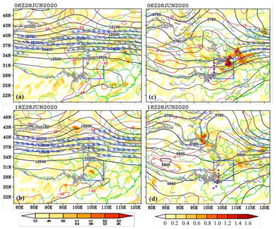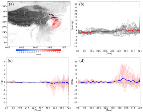 For the NEG type of air particles, there were mainly two sources (small black open boxes in Figure 5a): one was located in the regions south of the Tibetan Plateau, with an initial height of lower than 2000 m; and the other was situated over the northeastern section of the Tibetan Plateau, with a height of more than 4000 m. Final locations of these air particles were mainly located in the marginal area of the SCB (small black open circles in Figure 5a). Vorticity variation associated with this type of air particles (thick red line in Figure 5b) shows that, from 0 h (1800 UTC 23 June 2020) to 28 h (2200 UTC 24 June 2020), these air particles mainly had cyclonic vorticity (Figure 5b); from 29 h (2300 UTC 24 June 2020) to 46 h (1600 UTC 25 June 2020), their vorticity was mainly around 0; from 47 h (1700 UTC 25 June 2020) to 63 h (0900 UTC 26 June 2020), their vorticity became positive and kept increasing; and from 64 h (1000 UTC 26 June 2020) to 72 h (1800 UTC 26 June 2020, when the SWV formed), their vorticity decreased rapidly. From Figure 5c,d it can be seen that, terms TIL and STR were generally weak before 47 h, and then from 48 h on, they became stronger, as ascending motions and convergence were more intense around the SCB (not shown). Overall, tilting (i.e., TIL) dominated the decreasing of cyclonic vorticity of the NEG type of air particles (Figure 5c) during the period of 64–72 h, whereas, stretching (i.e., STR) mainly acted as maintaining their cyclonic vorticity (Figure 5d).