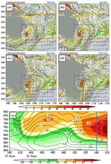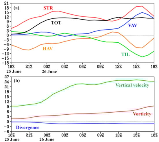where terms HAV and VAV represent the horizontal and vertical advection of vorticity, respectively. A total (TOT) term was defined as TOT = HAV + VAV + TIL + STR + APV. Equation (2) was used for a vorticity budget that was averaged within the SWV’s key region, which can effectively represent the mechanisms accounting for the SWV’s formation [10,11,24,25]. As Figure 9a illustrates, from 1800 UTC 25 to 1800 UTC 26 June 2020, a positive TOT appeared within the SWV’s key region (black line in Figure 9a), which was consistent with the increase of cyclonic vorticity within the key region (red line in Figure 9b). This was conducive to the SWV’s formation. Term STR (red line in Figure 9a), which was due to convergence (blue line in Figure 9b), contributed the largest to the positive TOT. This was consistent with the results in Section 4.2. The vertical transport of vorticity (blue line in Figure 9a) due to ascending motions (green line in Figure 9b) was the second dominant factor. This accorded with the vertical configuration of the convergence and cyclonic vorticity within the SWV’s key region (Figure 3e). In contrast, term TIL (green line in Figure 9a) was the most detrimental factor for the SWV’s formation. This was consistent with the finding in Section 4.2. The horizontal transport was the second important factor that decelerated the SWV’s formation.