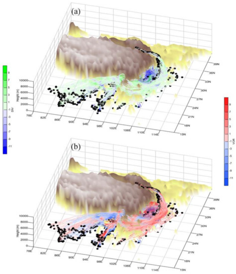 In order to clarify where the air particles that formed the SWV came from, we conducted a trajectory analysis by using the HYSLPIT model [21]. Hourly ERA5 reanalysis data was used in the model and a total of 589 points (at a horizontal resolution of 0.25° × 0.25°) that were evenly distributed within the SWV’s key region were used in the backward tracking. The start time was set at 1800 UTC 26 June 2020, and a period of 72 h was used in the backward tracking. The start locations of the tracking were at 750 hPa (as Figure 3e shows, 750 hPa was the central level of the SWV in this study where its maximum cyclonic vorticity appeared, and therefore this level could represent the SWV’s formation effectively) within the key region. Since the mean height of 750 hPa is about 2500 m above sea level, we defined the levels with a height of between 2000 m and 3000 m as the levels similar (LSM) to 750 hPa. The levels with a height of above 3000 m were defined as the levels above (LAB) 750 hPa, and the levels with a height of below 2000 m were defined as the levels below (LBE) 750 hPa.