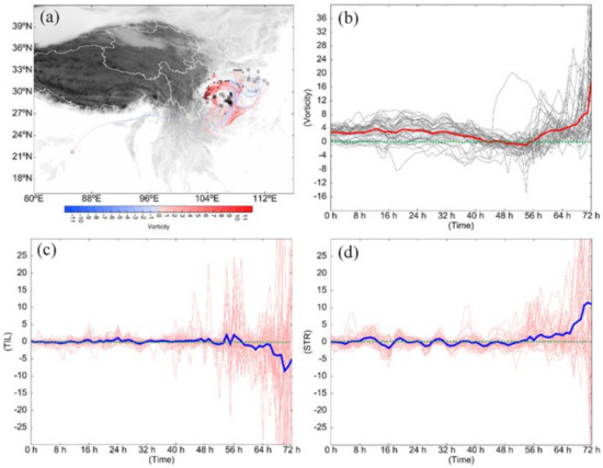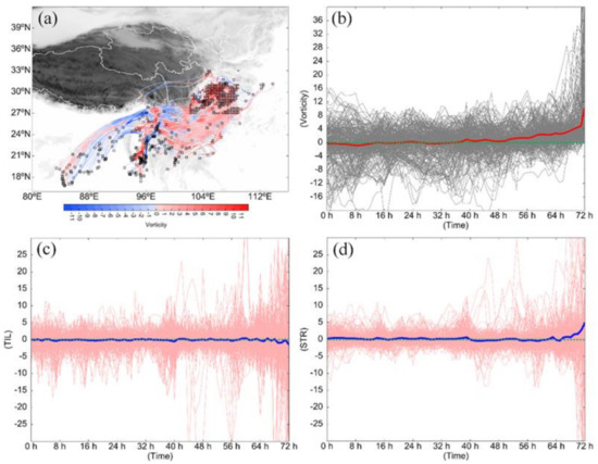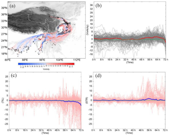 For the POS-LAB types of air particles, they mainly came from regions northeast of the Tibetan Plateau (with an initial height of above 4000 m) and the areas northeast of the key region (small black open boxes in Figure 8a). Final locations of these air particles were mainly located in the northern section of the SCB (small black open circles in Figure 8a). These air particles kept a cyclonic vorticity during their 72-h moving (Figure 8b), with a slow increase in vorticity appearing from 40 h (1000 UTC 25 June 2020) to the SWV’s formation time (i.e., 72 h). STR dominated this slow increase (Figure 8d), whereas TIL acted conversely (Figure 8c).