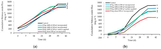 Cumulative nitrous oxide flux (mg N2O-N m−2) for (a) flock 2 and (b) flock 3 as a function of time. Treatments on day 42 not sharing a common letter are significantly different (p < 0.05).