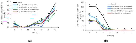 Average nitrate litter concentrations (mg NO3-N kg−1) for (a) flock 2 and (b) flock 3 as a function of time. Treatments not sharing a common letter are significantly different (p < 0.05).