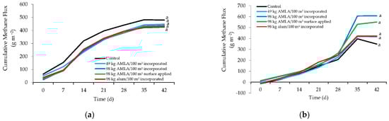 Cumulative methane flux (g CH4 m−2) for (a) flock 2 and (b) flock 3 as a function of time. Treatments on day 42 not sharing a common letter are significantly different (p < 0.05).
