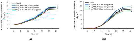 Cumulative carbon dioxide flux (kg CO2 m−2) for (a) flock 2 and (b) flock 3 as a function of time. Treatments on day 42 not sharing a common letter are significantly different (p < 0.05).