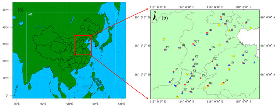 Model domain (a) and the spatial distribution (b) of the monitoring sites used in the model evaluation of the aerosols over North China Plain. The red dots indicate the component observation sites, the yellow dots indicate the PM2.5 observation sites, and the blue dots indicate the meteorological observation sites.