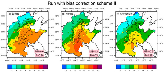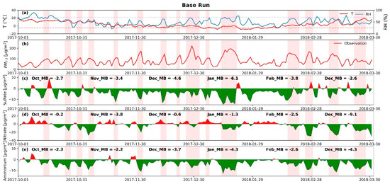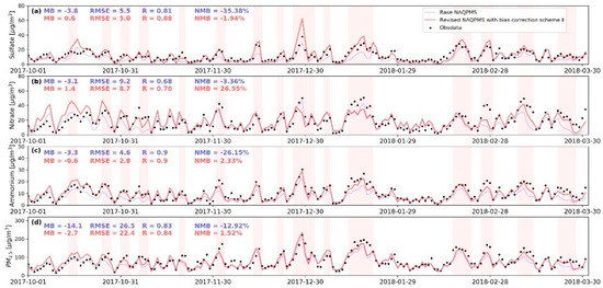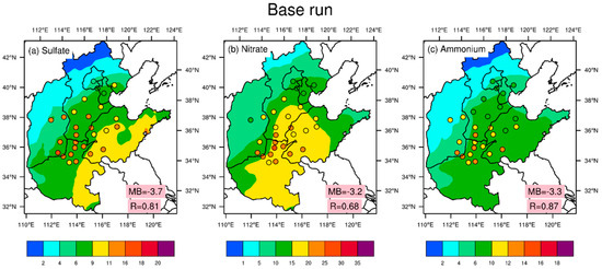 Figure 2 shows the spatial distributions of the simulated and observed sulfate, nitrate, and ammonium concentrations over North China Plain. In general, the base run underestimated the sulfate, nitrate, and ammonium concentrations at most sites throughout the six-month period, especially in heavily polluted areas. The underestimation of the sulfate and ammonium concentrations during the simulated period at 28 sites exceeded 30%, at −3.7 and −3.3 , respectively. The underestimation of the nitrate concentration exceeded 15%, and the model bias (MB) reached −3.2 . Figure 3 shows the temporal distributions of the model bias of sulfate, nitrate, and ammonium over North China Plain during the simulated period. The polluted period was defined as the period with a daily PM2.5 concentration higher than 75 , shown as the red background in Figure 3. As shown in Figure 3, sulfate was generally underestimated, which was relatively severe on the pollution days, especially in December and January. The monthly model biases in December and January were 4.6 and 6.1 , respectively. Nitrate was also underestimated during the polluted period but was overestimated during the cleaning period. The model bias of nitrate was the largest in March, and the largest daily model bias reached −29.3 (84%). Some studies have shown that observed nitrate are usually underestimated due to the sampling artifact caused by the evaporative loss of semi-volatile ammonium nitrate [46,47], but the simulation of nitrate was still significantly underestimated, which further confirms the model biases of nitrate simulation in winter. Similar to sulfate, ammonium mainly exhibited a negative bias. In addition to the large biases in December and January, there was also a notable underestimation in March. The monthly model biases in December, January, and March were −3.7 , −4.3 and −4.3 , respectively. This could be explained by the joint influence of the sulfate and nitrate simulation processes. The consistent underestimation of sulfate, nitrate, and ammonium suggest that a high uncertainty remained in the SIA simulations.