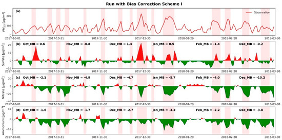 (a) Observed PM2.5 at corresponding sites from 1 October 2017 to 31 March 2018. The red background represents the pollution period. (b–d) Model bias (the mean value of 28 sites) simulated under bias correction scheme I of sulfate, nitrate and ammonium from 1 October 2017 to 31 March 2018. The red area indicates a positive bias, and the green area indicates a negative bias.