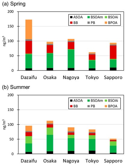 Seventeen organic tracer compounds were measured and categorized into six groups according to their origins (ASOA, biogenic SOAs from monoterpene and isoprene, biomass burning, plastic burning, and primary biogenic organic aerosols). The seasonal means of the organic tracers in spring and summer are shown in Table 3. The seasonal averages of the total organic tracer components at each site are shown in Figure 2. During spring, the lowest seasonal average was observed in Tokyo; Dazaifu had the highest average among all sites, which can be attributed to the higher concentration of BPOA. In Dazaifu, PM2.5 impactor for a high-volume (HVI2.5, Tokyo dylec) was used to sample PM2.5; however, others have reported that calcium ions contained in the soil (coarse particles) are collected when sampling PM2.5 []. Similar behavior has been reported when using other high-volume PM2.5 impactors []. Therefore, tracers for fungal spores and plants, which are abundant in coarse particles, showed high value at Dazaifu. In summer, the seasonal averages across the sites were comparable, although that at Sapporo was the lowest. Isoprene-derived SOA tracers were higher in summer than in spring; meanwhile, biomass burning tracers were clearly higher in spring than in summer. The detailed characteristics of each categorized group and the WSOC relationships are discussed in the following subsections.