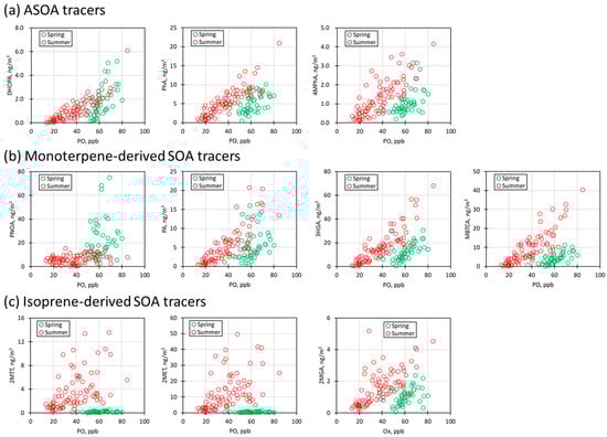 Scatter plots between potential ozone (PO) and SOA tracers with data from all sampling sites during spring (green) and summer (red): (a) ASOA tracers (DHOPA, phthalic acid (PhA), and 4-methylphthalic acid (4MPhA)) (b) monoterpene-derived SOA tracers (pinonic acid (PNOA), pinic acid (PA), 3-hydroxyglutaric acid (3HGA), and MBTCA), (c) isoprene-derived SOA tracers (2-methylthreitol (2MTT), 2-methylerythritol (2MET), and 2-methylglyceric acid (2MGA)).