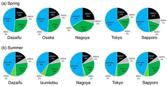 Total mono-aromatic, di-aromatic, monoterpene-derived, and isoprene-derived SOCs were estimated using the SOA-tracer method, as detailed in Table 6 and broken down by fraction in Figure 4. During spring, the seasonal mean concentration of monoterpene-derived SOCs was at its highest, followed using mono-aromatic SOCs in Dazaifu, Osaka, and Nagoya; meanwhile, Sapporo exhibited the opposite trend. In Tokyo, the means of the monoterpene-derived SOCs and mono-aromatic SOCs were comparable. The seasonal means of di-aromatic SOCs followed the two higher SOC means, and the mean concentrations of the isoprene-derived SOCs were the lowest at all sites. During summer, the seasonal mean concentration of the monoterpene-derived SOCs was the highest, followed using the mono-aromatic SOCs at all sites. The seasonal means of the di-aromatic SOCs were higher than those of the isoprene-derived SOCs in Nagoya and Tokyo but were comparable at the other three sites. The isoprene-derived SOCs were more than 10 times higher in summer than in spring; however, their contributions to the total estimated SOCs were insignificant at all sites. The total seasonal means of the estimated SOCs at each site ranged from 1.1 µg/m3 to 1.9 µg/m3 in spring and from 0.76 µg/m3 to 1.7 µg/m3 in summer. The total estimated SOCs could explain the variation in the WSOC fraction shown in Figure 4 from 39% to 63% in spring and from 46% to 54% in summer at each site. Notably, monoterpene-derived and mono-aromatic hydrocarbon SOCs occupied a high fraction of the total estimated SOCs in both spring (85–93%) and summer (75–82%) at each site. These results indicate that SOCs, especially monoterpene-derived and mono-aromatic SOCs, have a significant impact on the WSOC concentrations during both seasons in urban areas in Japan.