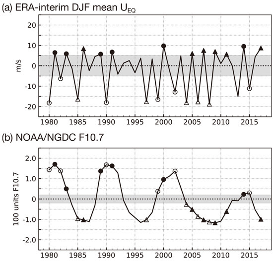 (a) Yearly time-series of the DJF mean zonal-mean zonal wind over 10° S–10° N at 50 hPa from ERA-Interim data. Absolute values of the equatorial zonal wind speed less than 5 m/s are gray-shaded; (b) Same as (a), but for the DJF mean of F10.7 from NOAA/NGDC. F10.7 is smoothed using a Fourier filter of a 2.5-year rectangular window, prior to calculating monthly mean values. Absolute values of F10.7 less than 0.2 are gray-shaded. Closed/open symbols denote QBO-W/QBO-E. Circles/triangles denote Smax/Smin. The closed triangles denote the QBO-W/Smin years, open triangles denote the QBO-E/Smin years, and open and closed circles denote the QBO-W/Smax and QBO-E/Smax years, respectively.