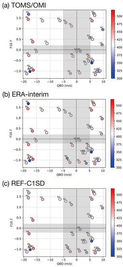 (a) Scatter plot between the QBO and F10.7 for the total ozone in March (color) averaged over the equivalent latitude from 70° N to 90 N for (a) TOMS/OMI observations, (b) ERA-Interim reanalysis data, and (c) REF-C1SD experiments. The average values of the TOMS/OMI observations, ERA-Interim reanalysis data, and REF-C1SD experiments are 410.1 DU, 408.4 DU, and 415.0 DU, respectively, which correspond to white on the color scale.