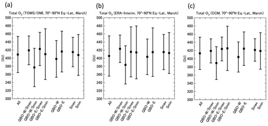 Figure 3 shows the monthly mean total ozone in the Arctic for March averaged for the years in the QBO and 11-year solar cycle phases and their standard deviations. Panels (a), (b), and (c) correspond to those in Figure 2, i.e., the results from TOMS/OMI, ERA-interim, and REF-C1SD. Because of the large standard deviations compared to the mean value differences, it is hard to find significant differences in the total ozone amount among the categories; the total ozone amount in the QBO-W/Smin years indicates 42 DU (~10%) smaller than in the average of QBO-W/Smax years and 46 DU (~11%) smaller than in the average of QBO-E/Smax years for the TOMS/OMI data (panel (a)) and CCM (panel (c)), although it is not statistically significant at the 68% confidence level (1 sigma). However, most part of the upper half of the error bar of the QBO-W/Smax years is located above the error bar of the QBO-W/Smin years and the lower half of the error bar of the QBO-W/Smin years is located below the error bar of the QBO-W/Smax years. A similar situation is evident between the QBO-W/Smin years and the QBO-E/Smax years in panels (a) and (c). The total ozone in the QBO-E/Smin years in panels (a), (b), and (c) and that of the ERA-Interim data in the QBO-E/Smax years in panel (b) have very large standard deviations; hence, it is difficult to compare these total ozone amounts to that in the QBO-W/Smin years. Furthermore, comparisons of the total ozone amount between QBO-W and QBO-E and between Smax and Smin are also difficult owing to the large standard deviation and small mean value differences.