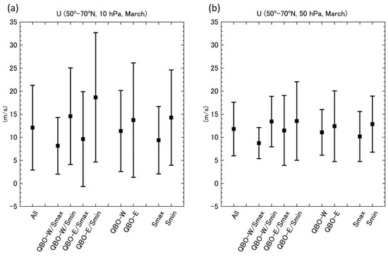 Monthly mean, zonal mean zonal wind averaged over 50−70 N at 10 hPa (a) and 50 hPa (b) in March from ERA-Interim data with units of m/s. The average values for all the years 1980–2011, the four QBO/solar activity phase groups, the two QBO phase groups, and the two solar activity phase groups are indicated by squares with the standard deviations.