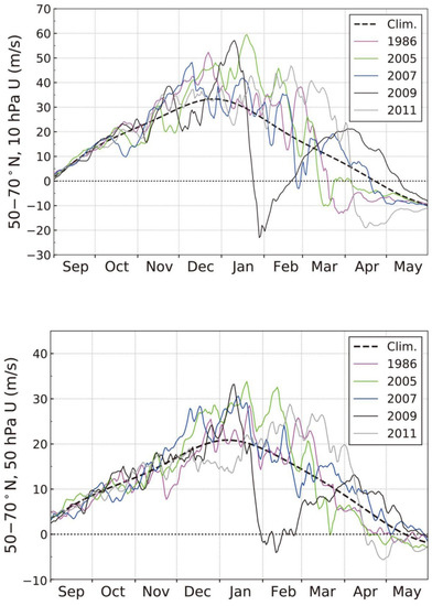 Daily time-series of the zonal mean zonal wind over 50−70 N at 10 hPa (upper panel) and 50 hPa (lower panel) from ERA-Interim reanalysis data (solid lines with units of m/s). Purple line: 1986 (September 1985−May 1986), green line: 2005, blue line: 2007, black line: 2009, and gray line: 2011. The broken line denotes the daily climatology of the zonal wind from 1979−2011, smoothed using a Fourier filter with a rectangular window of 3 months.