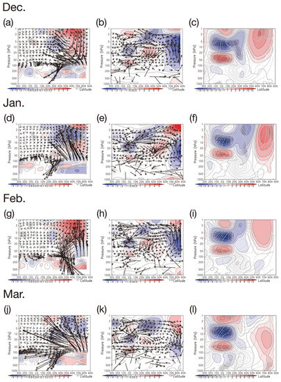 Figure 6 indicates anomalies of the monthly mean EP-flux, divergence, residual mean circulation, temperature, and zonal mean zonal wind during the QBO-W/Smin years, based on climatology. This figure is a counterpart of Figure 9 for the QBO-W/Smax years in Yamashita et al. [10]. Anomalies of the EP-flux, divergence, temperature, and zonal mean zonal wind are similar in December and January between the QBO-W/Smax and QBO-W/Smin years, whereas they are significantly different in February and March. The easterly anomalies are evident in the Arctic during February and March for the QBO-W/Smax years, as indicated by the blue color in Figure 9 of Yamashita et al. [10]. Moreover, the westerly anomalies (red color) in February and March are also evident for the QBO-W/Smin years (the panels “i” and “l” in Figure 6). Accordingly, high temperature anomalies (red color) are observed in the Arctic lower stratosphere during February and March for the QBO-W/Smax years whereas low temperature anomalies (blue color) are observed during February and March for the QBO-W/Smin years (the panels “h” and “k” in Figure 6). The direction of the EP-flux anomalies and the distribution of the EP-flux divergence anomalies in the Arctic stratosphere is similar in December and January; however, it is different in February and March (panels “a”, “d”, “g”, and “j” in Figure 6). These figures indicate that the dynamical fields in February and March are different between the QBO-W/Smin years and the QBO-W/Smax years, and those in the QBO-W/Smin years indicates a stronger polar vortex.