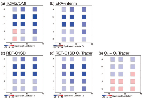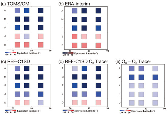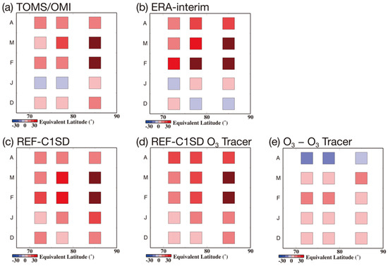 To distinguish the effect of the chemical ozone destruction from that of ozone transport for the total ozone anomaly, we analyze the total ozone anomaly of the passive ozone tracer, which is not affected by any chemical change in the CCM (Figure 7d). However, as described in Section 2, it is noteworthy that the ozone tracer is switched off from chemical reactions in the altitude range between 220 hPa and 12 hPa. Thus, the ozone tracer concentration near the boundaries of this altitude range can be affected by chemical reactions at altitudes below 220 hPa and above 12 hPa, where the ozone tracer concentration is identical to the ozone concentration, and is affected by chemistry as well as transport. The total ozone of the passive ozone tracer indicates the presence of negative ozone anomalies, with values of −10 to −20 DU within the equivalent latitudes of 70–75° N and values of less than −20 DU within the equivalent latitudes of 75–90° N in February–March.